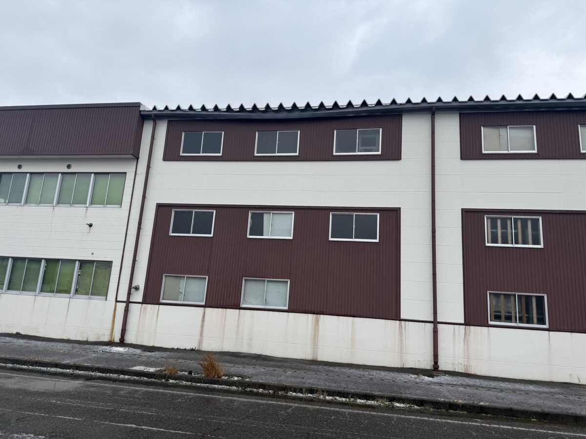 新潟市の工場の雨樋が雪の影響で歪んでいました。